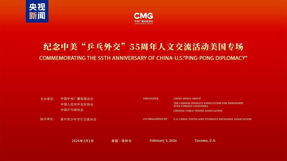 当地时间2月3日,纪念中美“乒乓外交”55周年人文交流活动美国专场在华盛顿州塔科马市林肯中学举行。本次活动由中国中央广播电视总台、中国人民对外友好协会和中国乒乓球协会共同主办,美中青少年学生交流协会协办。中宣部副部长、中央广播电视总台台长慎海雄,中国驻美大使谢锋,中国人民对外友好协会会长杨万明,中国乒乓球协会主席王励勤作视频致辞。中国驻旧金山总领事张建敏,“乒乓外交”亲历者、前美国乒乓球队队员康妮·史维利斯出席活动并致辞。前美国乒乓球队队员朱迪·霍夫罗斯特、华盛顿州斯特拉孔市前市长迪克·穆里、林肯中学校长卡尔·霍塞斯、华盛顿州友好人士以及林肯中学师生等近500位嘉宾参加活动。